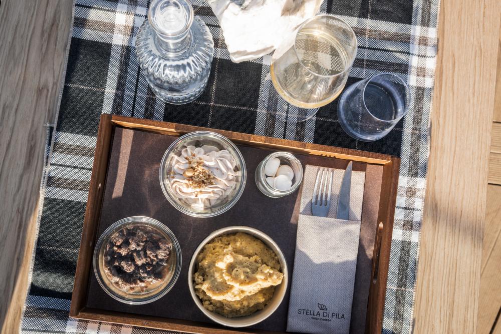 The Stella di Pila welcomes guests with an essential and refined style signed by Skyway Monte Bianco: from breakfast to aperitif, from buffet lunch to hot or cold drinks served at the bar. Everything is accompanied by a selection of wines from the Aosta Valley for a food and wine experience in contemplation of the surrounding landscape.