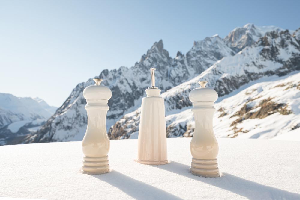 Polenta, fondue aux pommes de terre montagnardes, soupes alpines et viandes locales trouvent leur écrin parfait dans les cocottes blanches, transformant chaque plat en un moment d'exception célébrant l'authenticité des saveurs et la pureté du design. Les élégants coffrets à huile et à vinaigre Le Creuset, ainsi que les moulins à poivre et à sel, complètent le service de table, autant de détails qui célèbrent le geste, le soin et le plaisir de dîner, même en haute altitude.