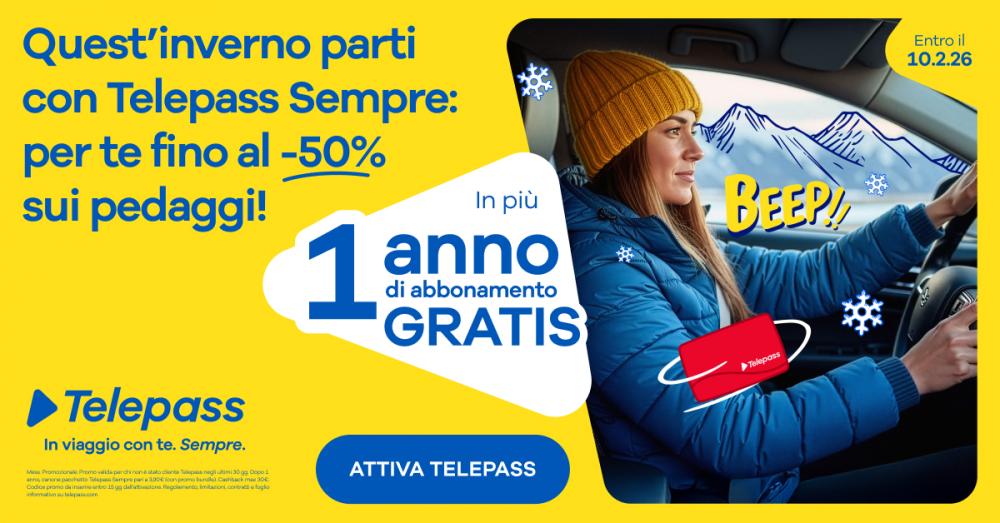Se non sei ancora cliente Telepass Sempre, vivi lo spirito della montagna con una promo speciale: 1 anno di abbonamento gratis e fino al 50% sui pedaggi in Italia.